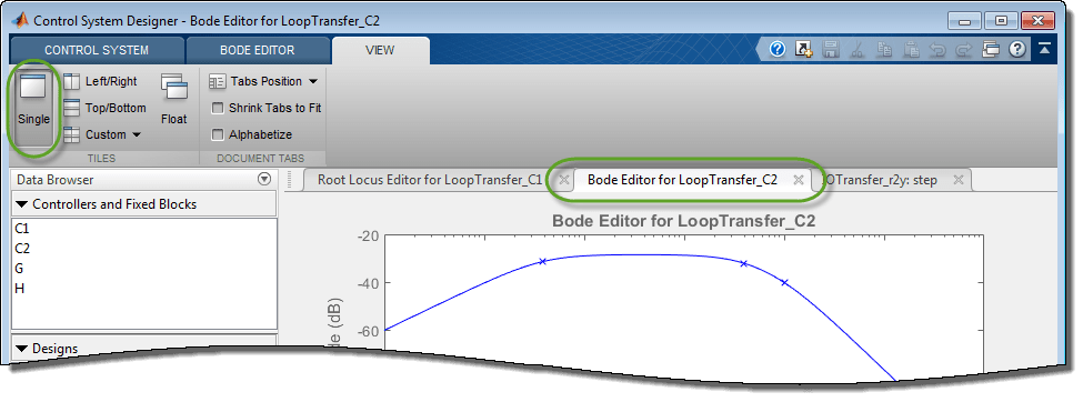 Поскольку сначала настраивается внутренний цикл, настройте графики так, чтобы они отображались только на графике редактора Bode с внутренним циклом. На вкладке Вид (View) нажмите кнопку Один (Single), а затем выберите Редактор модов (Bode Editor) для LoopTransfer_C2.
