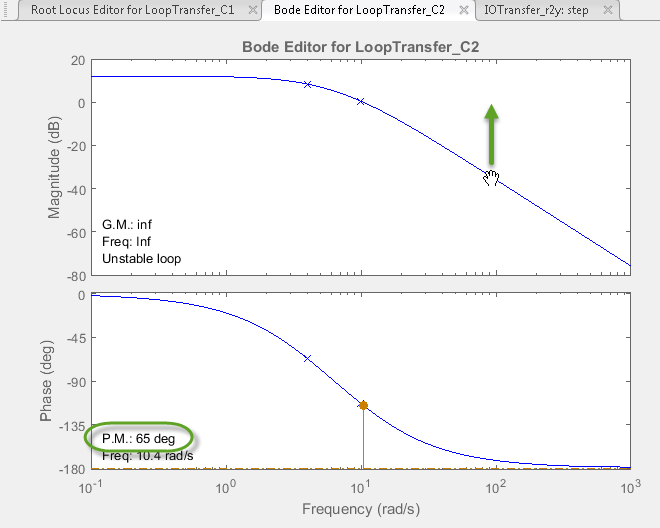 На графике редактора модов перетащите отклик величины вверх до тех пор, пока поле фазы не станет равным 65 градусам. Это соответствует коэффициенту усиления компенсатора 107. Увеличение коэффициента усиления дополнительно уменьшает фазовый запас ниже 65 градусов.