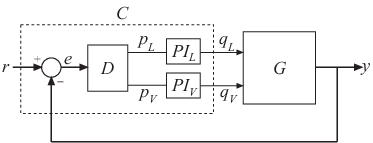 Например, в системе управления, показанной на следующем рисунке, контроллер C получает измерение yи опорный сигнал r. Контроллер создает элементы управления qL и qV в качестве выходных данных.
