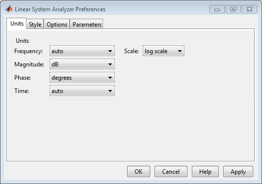 Дефолт auto использование опции rad/TimeUnit как единицы частоты относительно единиц системного времени, где TimeUnit - системные единицы времени, указанные в TimeUnit свойство системы на графиках частотной области. Для нескольких систем с различными единицами времени используются единицы первой системы.