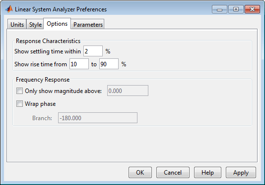 В окне «Анализатор линейной системы» выберите «Редактирование» > «Настройки анализатора линейной системы». Диалоговое окно Настройки анализатора линейной системы (Linear System Analyzer Preferences) позволяет настраивать различные свойства анализатора линейной системы, включая единицы измерения, шрифты и различные другие характеристики. На этом рисунке показан редактор, открытый на первой панели.