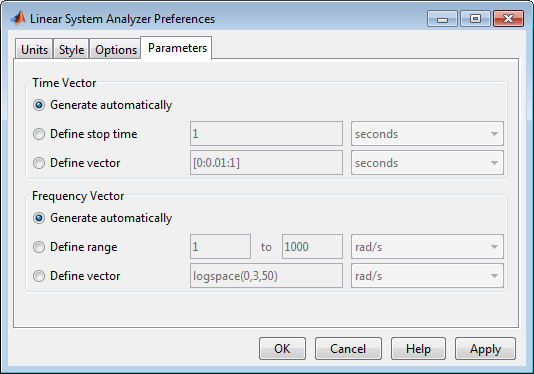 Панель Параметры (Parameters), показанная ниже, используется для задания входных векторов для моделирования времени и частоты.
