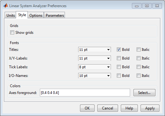 Панель Стиль (Style) используется для переключения видимости сетки и задания настроек шрифта и цветов переднего плана осей для всех графиков в анализаторе линейной системы. На этом рисунке показана панель «Стиль».