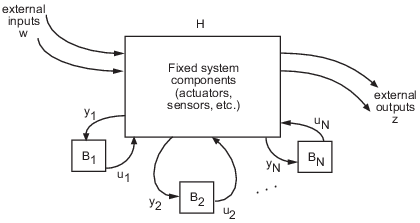 и группируют перестраиваемые элементы управления B1, . , BN в блок-диагональную конфигурацию C. P включает в себя все фиксированные компоненты архитектуры управления - исполнительные механизмы, датчики и другие неперестраиваемые элементы - и их взаимосвязи.
