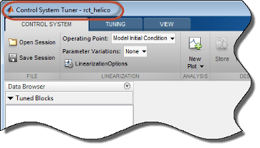 В командной строке MATLAB ® используйте controlSystemTuner для открытия тюнера системы управления для настройки модели Simulink. Например, следующая команда открывает модуль настройки системы управления для модели rct_helico.slx.