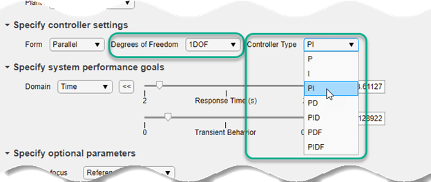 Укажите тип при открытии приложения - укажите type аргумент для pidTuner при открытии тюнера PID. Например, pidTuner(G,'PIDF2') открывает PID-тюнер с начальной конструкцией, который является 2-DOF PID-контроллером с фильтром по термину производной.