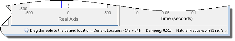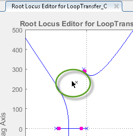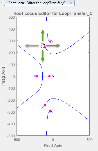 В редакторе корневых локусов перетащите новые полюса в расположение около -140 ± 260i. При перетаскивании одного полюса он обновляется автоматически.