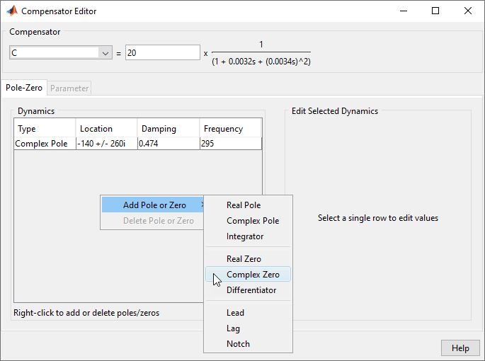 Чтобы добавить сложную нулевую пару к компенсатору, в диалоговом окне Редактор компенсатора щелкните правой кнопкой мыши таблицу Dynamics и выберите Добавить полюс/ноль > Комплексный ноль