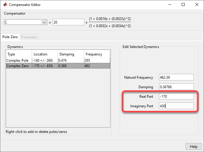 В таблице Dynamics щелкните строку Комплексный ноль. Затем в разделе Править выбранную динамику укажите действительную часть -170 и воображаемая часть 430.