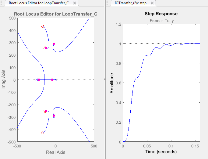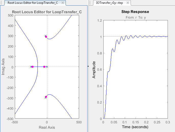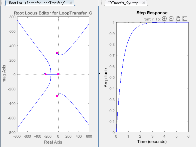 На графике Root Locus Editor расположения полюсов с замкнутым контуром перемещаются, отражая новое значение усиления. Кроме того, обновляется график ответа на шаг.