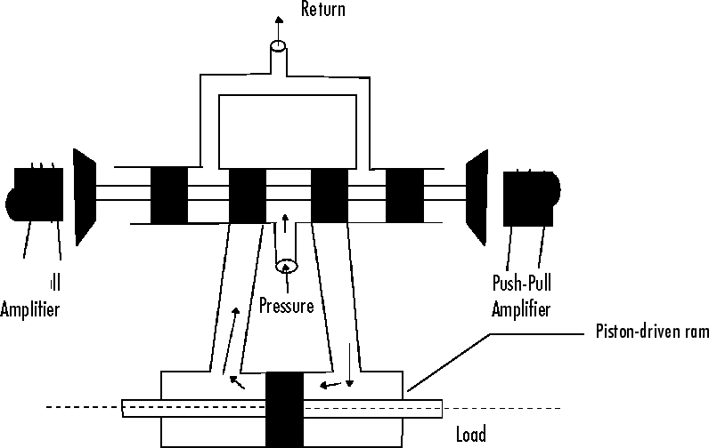 Усилие на катушке пропорционально току в катушке электромагнита. По мере перемещения золотника клапан открывается, позволяя гидравлической жидкости высокого давления проходить через камеру. Движущаяся текучая среда заставляет поршень двигаться в противоположном направлении от катушки. Для получения дополнительной информации об этой модели, включая вывод линеаризованной модели, см. [1].