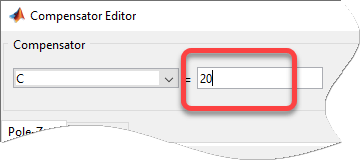Чтобы создать более быстрый отклик, увеличьте коэффициент усиления компенсатора. В редакторе корневого местоположения щелкните правой кнопкой мыши область печати и выберите «Редактировать компенсатор».