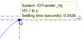 Чтобы проверить точное время настройки, щелкните правой кнопкой мыши область графика Ответ шага (Step Response) и выберите Признаки (Characteristics) > Время настройки (Settling Time). На графике ответа появляется индикатор времени расчета.