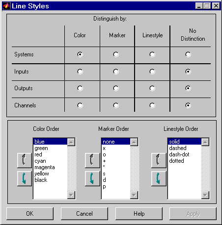 Можно использовать матрицу «Отличить по» (верхняя половина окна), чтобы указать свойство линии, которое будет изменяться на всех графиках ответа. Можно сгруппировать несколько кривых графика по системам, входам, выходам или каналам (отдельные взаимосвязи ввода/вывода). Обратите внимание, что в редакторе стилей линий используются переключатели, что означает, что для каждой группировки (системы, ввода и т.д.) можно назначить только одну настройку свойств.