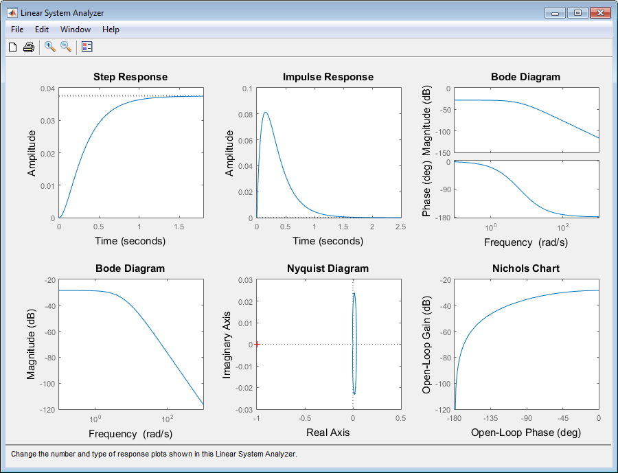 Доступные графики отклика включают в себя шаги, импульсы, Боде (величины и фазы или только величины), Найквист, Николс, сигма, карты полюсов/нулей и карты полюсов/нулей ввода-вывода.