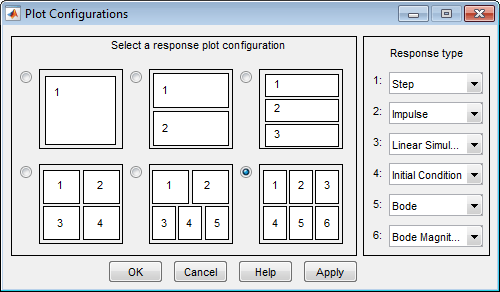 Функция Тип графика (Plot Type) контекстного меню работает с существующими графиками, но также можно добавить графики в анализатор линейной системы с помощью окна Конфигурации графика (Plot Configuration). По умолчанию анализатор линейной системы открывается с откликом шага с замкнутым контуром. Для изменения конфигурации открытого средства просмотра выберите пункт «Конфигурация печати» в меню «Правка».