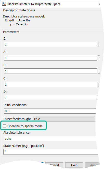 Установите флажок Linearize to sparse в блоке Descriptor State-Space (Simulink) для линеаризации в sparss модель. Вы также можете достичь этого, установив LinearizerToSparse параметр для 'on' в поле Состояние дескриптора (Descriptor State-Space) (Simulink). По умолчанию флажок Линеаризовать для разрежения (Linearize to sparse) не установлен, и LinearizerToSparse является 'off'. Блочный уровень LinearizeToSparse игнорируется при указании замены блока либо с помощью SCDBlockLinearizationSpecification параметр блока или blocksub вход в linearize(Проект управления симуляцией).