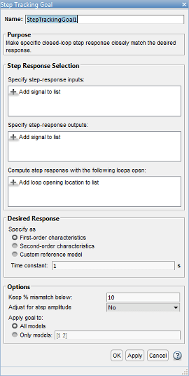 В окне «Настройка системы управления» на вкладке «Настройка» нажмите кнопку «Создать цель». Выберите тип цели, которую требуется создать. Откроется диалоговое окно настройки цели, в котором можно предоставить подробные спецификации цели. Например, выберите Tracking of step commands (Отслеживание команд шага), чтобы конкретный ответ на шаг системы управления соответствовал требуемому ответу.