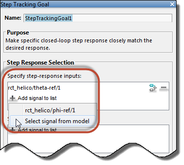 В разделе Specify step-response input щелкните Add signal to list (Добавить сигнал в список). Появится список доступных местоположений ввода.