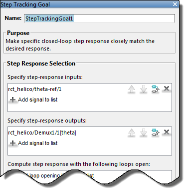 Аналогично, укажите местоположения, в которых измеряется отклик шага, в списке выходов отклика шага. Например, следующая конфигурация ограничивает ответ на ввод шага, применяемый в theta-ref и измерено при theta в модели Simulink rct_helico.