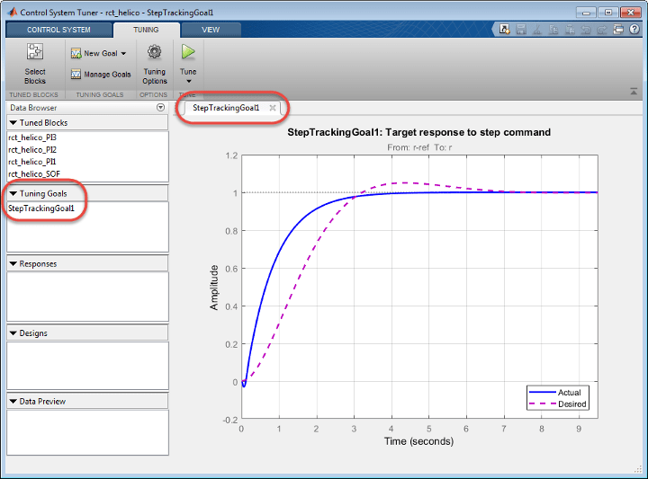 Например, при настройке с помощью следующей конфигурации модуль настройки системы управления оптимизирует StepRespGoal1, при условии MarginsGoal1. Цель настройки PolesGoal1 игнорируется.