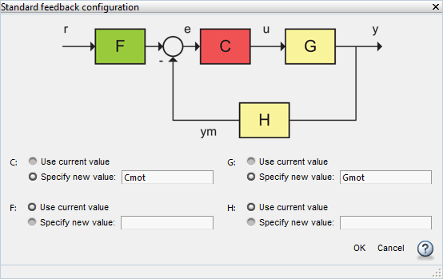 Введите созданные значения для C и G. Модуль настройки системы управления считывает эти значения из рабочей области MATLAB. Нажмите кнопку ОК.