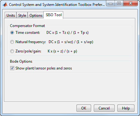 Опции Боде (Bode Options) - по умолчанию конструктор систем управления показывает полюса и нули завода и датчика синими x и o соответственно. Снимите этот флажок, чтобы исключить полюса и нули завода из графика Боде. Обратите внимание, что полюса компенсатора и нули (красным цветом) все равно появятся.