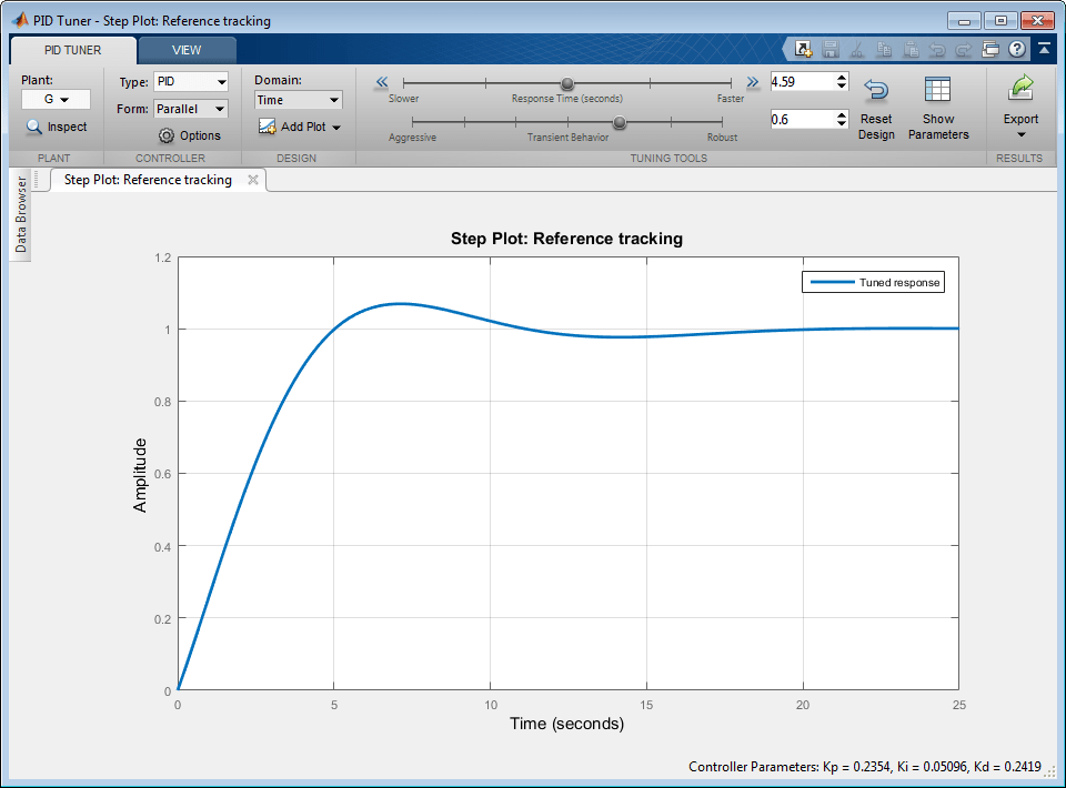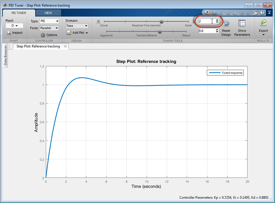 Предположим, что для этого примера приложение требует более быстрого ответа, чем первоначальный проект PID-тюнера. В текстовом поле рядом с ползуном Время ответа введите 2.