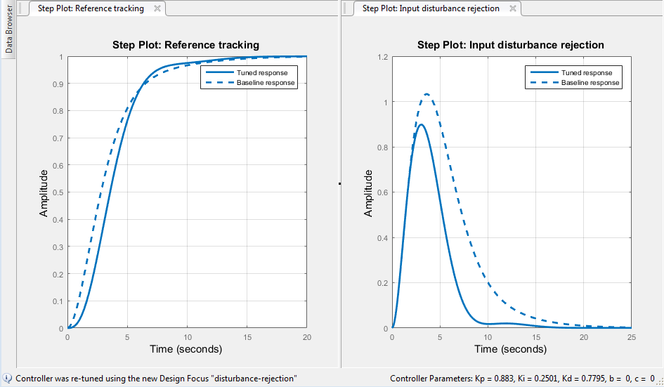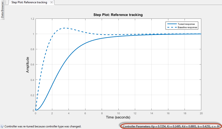 PID-тюнер генерирует контроллер 2-DOF с тем же целевым временем отклика. Параметры контроллера, отображаемые в правом нижнем углу, показывают, что PID-тюнер настраивает все коэффициенты контроллера, включая веса уставок. b и c, чтобы сбалансировать производительность и надежность. Сравните производительность контроллера 2-DOF (сплошная линия) с производительностью контроллера 1-DOF, сохраненного в качестве базовой линии (пунктирная линия).