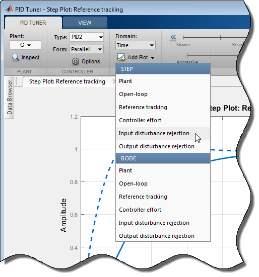 Добавление второй степени свободы устраняет переполнение в отклике отслеживания ссылок. Затем добавьте график ответа на шаг для сравнения характеристик отклонения возмущений двух контроллеров. Выберите «Добавить график» > «Отклонение нарушения ввода».