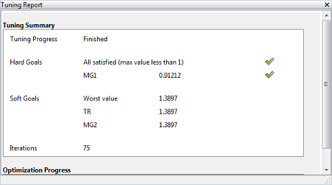 Программа настройки сообщает окончательные скалярные значения для каждой цели настройки. Когда конечное значение fi (x) или gj (x) меньше 1, соответствующая цель настройки выполняется. Значения, превышающие 1, указывают, что цель настройки не выполняется по крайней мере для некоторых условий. Например, цель настройки, которая описывает ограничение частотной области, может быть удовлетворена на одних частотах, а не на других. Чем ближе значение к 1, тем ближе выполняется цель настройки. Таким образом, эти значения дают обзор того, насколько успешно настраиваемая система соответствует вашим требованиям.