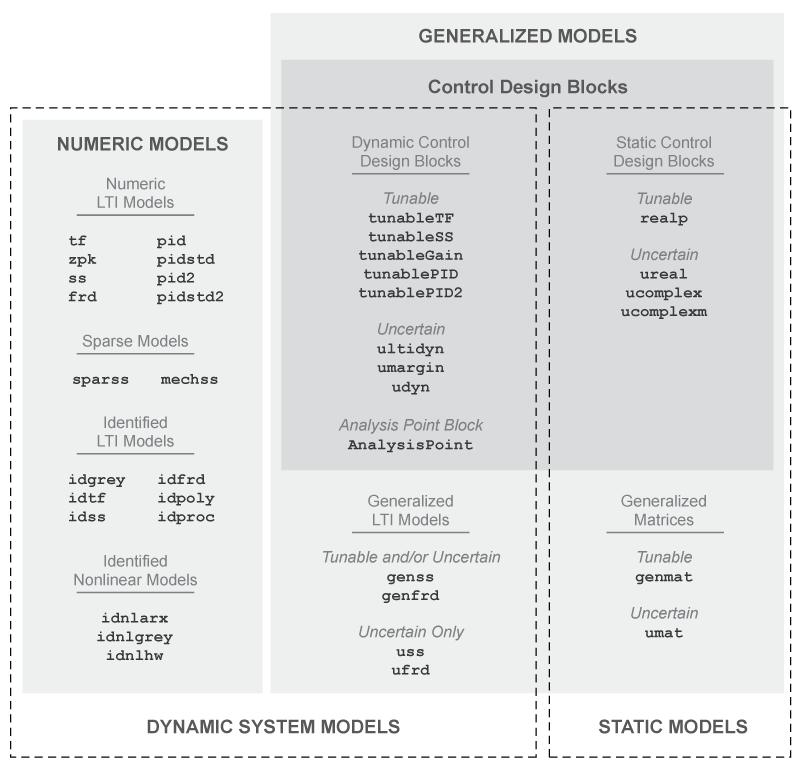 На следующей схеме показаны взаимосвязи между типами объектов модели в программах Control System Toolbox™, Rustive Control Toolbox™ и System Identification Toolbox™. Типы моделей, начинающиеся с id требуется программное обеспечение System Identification Toolbox. Типы моделей, начинающиеся с u требуется программное обеспечение Rustive Control Toolbox. Все другие типы моделей доступны с помощью программного обеспечения Control System Toolbox.