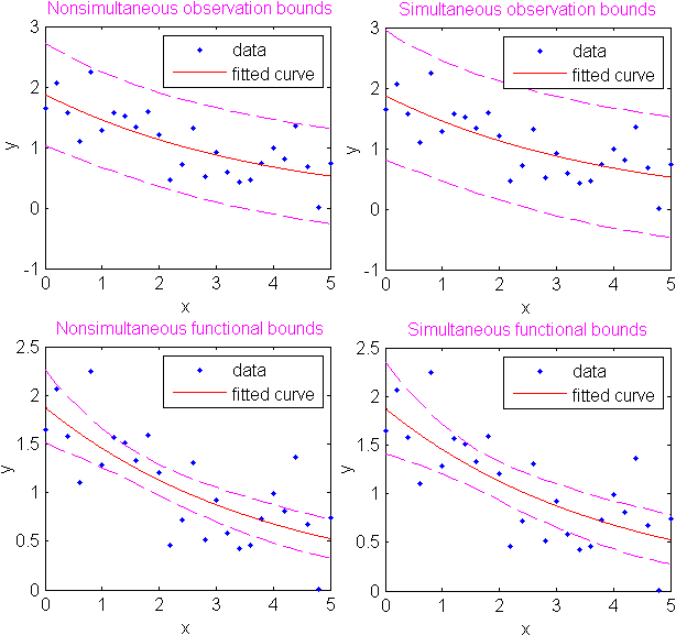 subplot(2,2,1) plot(fitresult,x,y), hold on, plot(x,p11,'m--'), xlim([0 5]), ylim([-1 5]) title('Nonsimultaneous Observation Bounds','FontSize',9) legend off subplot(2,2,2) plot(fitresult,x,y), hold on, plot(x,p12,'m--'), xlim([0 5]), ylim([-1 5]) title('Simultaneous Observation Bounds','FontSize',9) legend off subplot(2,2,3) plot(fitresult,x,y), hold on, plot(x,p21,'m--'), xlim([0 5]), ylim([-1 5]) title('Nonsimultaneous Functional Bounds','FontSize',9) legend off subplot(2,2,4) plot(fitresult,x,y), hold on, plot(x,p22,'m--'), xlim([0 5]), ylim([-1 5]) title('Simultaneous Functional Bounds','FontSize',9) legend({'Data','Fitted curve', 'Prediction intervals'},... 'FontSize',8,'Location','northeast')