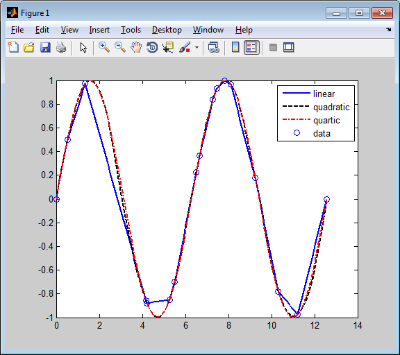 Если требуется интерполяция на площадках, отличных от разрывов и/или сплайнов, отличных от кубических сплайнов, с помощью простых узлов, то используется spapi команда. В самом простом виде, вы бы сказали sp = spapi(k,x,y); в котором первый аргумент, k, задает порядок интерполяции сплайна; это число коэффициентов в каждой части многочлена, т.е. на 1 больше номинальной степени ее частей многочлена. Например, на следующем рисунке показан линейный, квадратичный и квадратичный сплайн, интерполированный с данными, полученными с помощью операторов