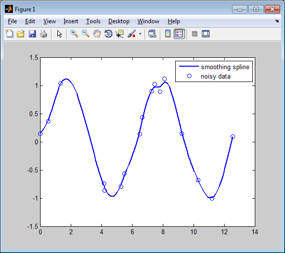 Иногда можно просто получить самый гладкий кубический сплайн. sp который находится в пределах заданного допуска tol данных в том смысле, что norm(noisy - fnval(sp,x))^2 <= tol. Этот сплайн создается с помощью команды sp = spaps(x,noisy,tol) для определенного допуска tol.