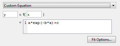 Используйте пользовательское уравнение для определения собственных уравнений. Пример пользовательского уравнения появляется, если выбрать Пользовательское уравнение (Custom Equation) из списка, как показано здесь для данных кривой.
