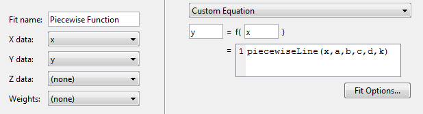 Используйте ваш piecewiseLine в приложении «Фитинг кривой» выберите тип аппроксимации «Пользовательская формула», а затем введите выражение функции в текстовое поле пользовательской формулы. Функция принимает данные x и некоторые параметры для подгонки.