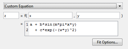 В нижнем поле отредактируйте пример, чтобы определить собственное пользовательское уравнение. Можно ввести любое допустимое выражение MATLAB ® в терминах имен переменных. Можно указать имя функции или сценария (см. раздел «Подгонка кривой, определенной файлом» в приложении «Подгонка кривой»).