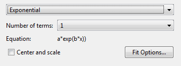 Панель инструментов вычисляет оптимизированные начальные точки для экспоненциальных посадок на основе текущего набора данных. Можно переопределить начальные точки и указать собственные значения в диалоговом окне «Параметры вписывания».