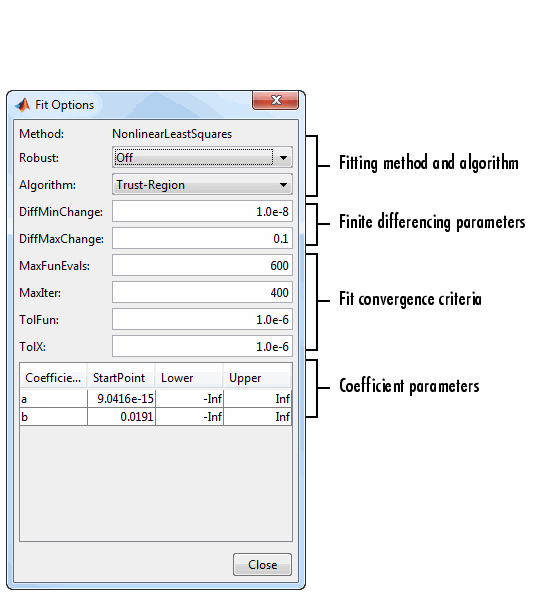 Проверьте параметры подгонки, если требуется изменить параметры подгонки, такие как начальные значения коэффициентов и границы ограничений, соответствующие данным, или измените настройки алгоритма. Дополнительные сведения об этих опциях см. в таблице свойств для нелинейных квадратов fitoptions справочная страница.