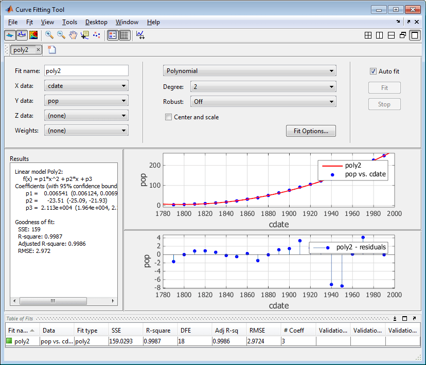 Пример воспроизведения этого интерактивного анализа данных переписи с помощью командной строки см. в разделе Подгонка полиномиальной кривой.