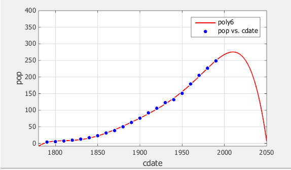 plot(fittedmodel, cdate, pop) hold on plot(fittedmodel, 2000:10:2050, y) hold off
