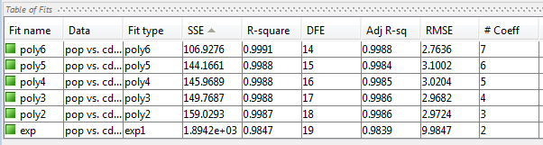Крупнейшая МРЗ для exp1 указывает на плохую подгонку, которую вы уже определили, проверяя подгонку и остатки. Наименьшее значение SSE связано с poly6. Однако поведение этого вписывания за пределы диапазона данных делает его плохим выбором для экстраполяции, поэтому вы уже отклонили это вписывание, изучив графики с новыми пределами оси.