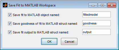 Можно использовать команду Сохранить в рабочую область (Save to Workspace) для экспорта выбранного вписывания и связанных результатов вписывания в рабочую область MATLAB. Аппроксимация сохраняется как объект MATLAB, а связанные результаты аппроксимации сохраняются как структуры.