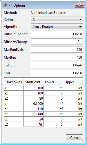 При изменении параметров подгонки приложение «Фитинг кривой» выполняет подгонку. Нажмите Enter или закройте диалоговое окно «Параметры посадки», чтобы убедиться, что последнее изменение применено к посадке.