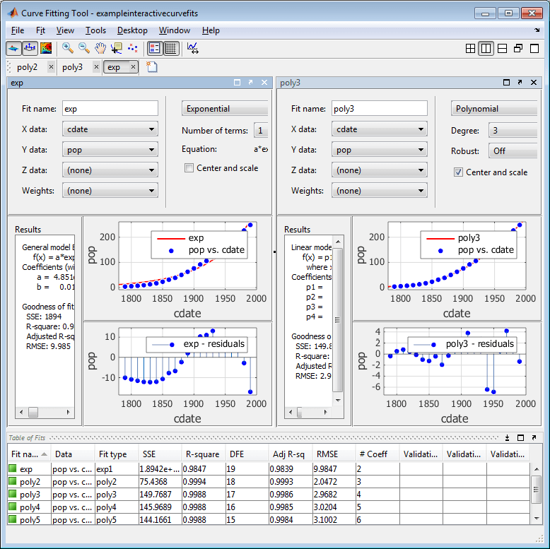 После создания нескольких посадок можно сравнивать различные типы посадок и настройки рядом в приложении «Фитинг кривой» (Curve Fitting). Можно одновременно просматривать графики и просматривать статистику соответствия для сравнения посадок. В этом разделе описывается сравнение нескольких посадок.