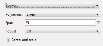 Если входные переменные имеют очень разные масштабы, включите и выключите опцию «Центр и масштаб», чтобы увидеть разницу в посадке поверхности. Нормализация входных данных может сильно повлиять на результаты фитинга Lowess.