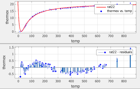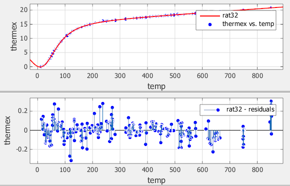 load hahn1; f = fit( temp, thermex, 'rat32') plot(f,temp,thermex)