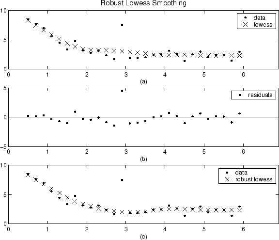 График (a) показывает, что отклонение влияет на сглаженное значение для нескольких ближайших соседей. График (b) предполагает, что остаток отклонения больше шести средних абсолютных отклонений. Следовательно, надежный вес равен нулю для этой точки данных. График (c) показывает, что сглаженные значения, соседние с отклонением, отражают основную часть данных.