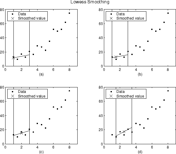 Обратите внимание, что диапазон не изменяется по мере перехода от точки данных к точке данных. Однако в зависимости от числа ближайших соседей функция регрессионного веса может быть несимметричной относительно точки данных, подлежащей сглаживанию. В частности, участки (a) и (b) использовать асимметричную весовую функцию, в то время как графики (c) и (d) использовать симметричную весовую функцию.